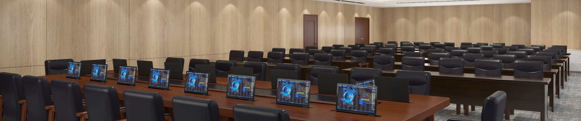 大屏拼接系統(tǒng)是12塊屏幕進行拼接,視頻會議信號、桌插VGA信號、液晶升降電腦信號等一切視頻源都能夠在大屏幕上顯示,清晰直觀。液晶升降系統(tǒng)不再是普 通的液晶顯示器,而是可觸摸式的一體化PC機,每一位與會者席位前都有一臺可觸摸式PC機和嵌入式麥克風。通過矩陣切換系統(tǒng)可以把PC的內(nèi)容在大屏上顯示。需要發(fā)言時,只要輕輕一按麥克風的開關(guān),麥克風紅燈亮起,表示話筒已經(jīng)打開,可以講話了,另外主席麥克風具有優(yōu)先發(fā)言的權(quán)利,別人無論誰在發(fā)言,主席都具有最優(yōu)先的權(quán)利。召開視頻會議時,通過會場的前后攝像機加上與會者席位前方的麥克風相互配合,即可進行攝像跟蹤,當發(fā)言者按下麥克風的開關(guān)時,攝像機 自動跟蹤,對發(fā)言者進行特寫。